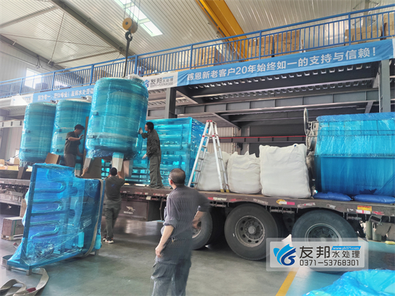 郑州友邦工厂发往江苏张家港的10吨水处理设备正在装车发货中,客户为了新建产线配套10吨水处理设备。该设备是友邦专为张家港饮品厂设计的,设备机架,管材管件,水箱,预处理罐等均采用食品级304材质。